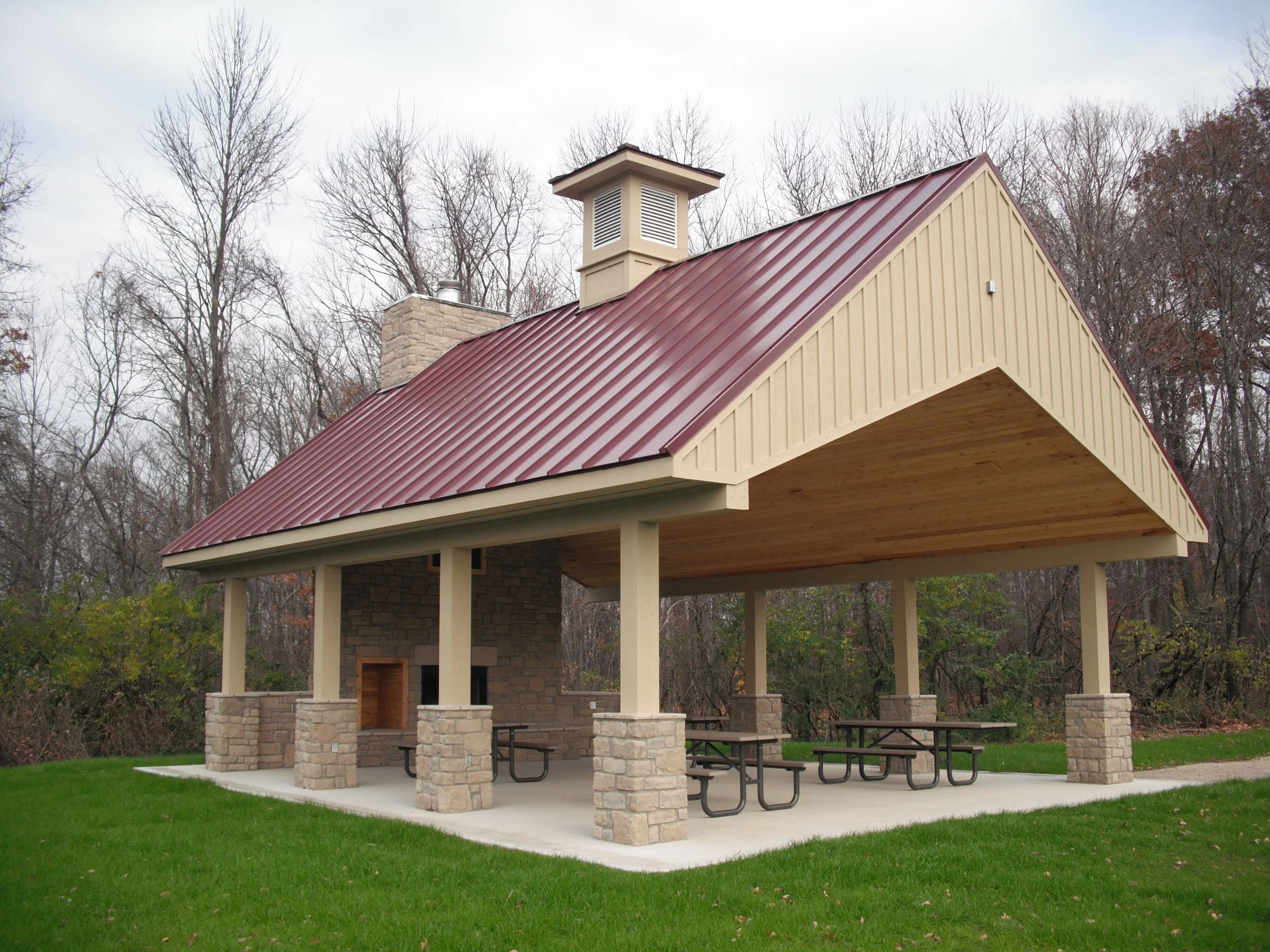 This project was completed in conjunction with a public works grant from The Ohio Department of Natural Resources. The project consisted of an 1,100 SF open air shelter facility, with wood framing and wood truss metal roof. The exterior gable end includes a large scale stone wood burning fireplace and hearth area in front of picnic tables.