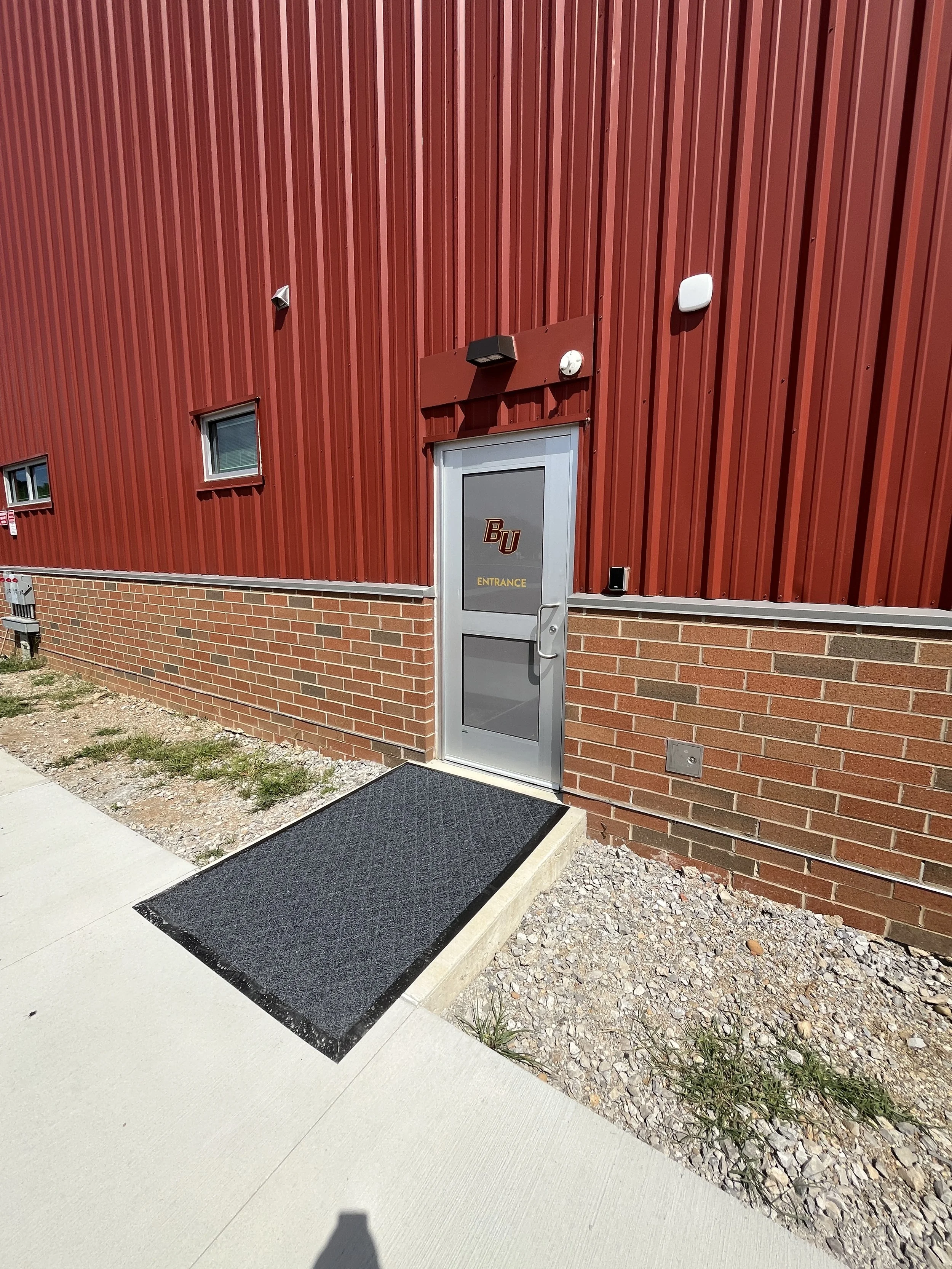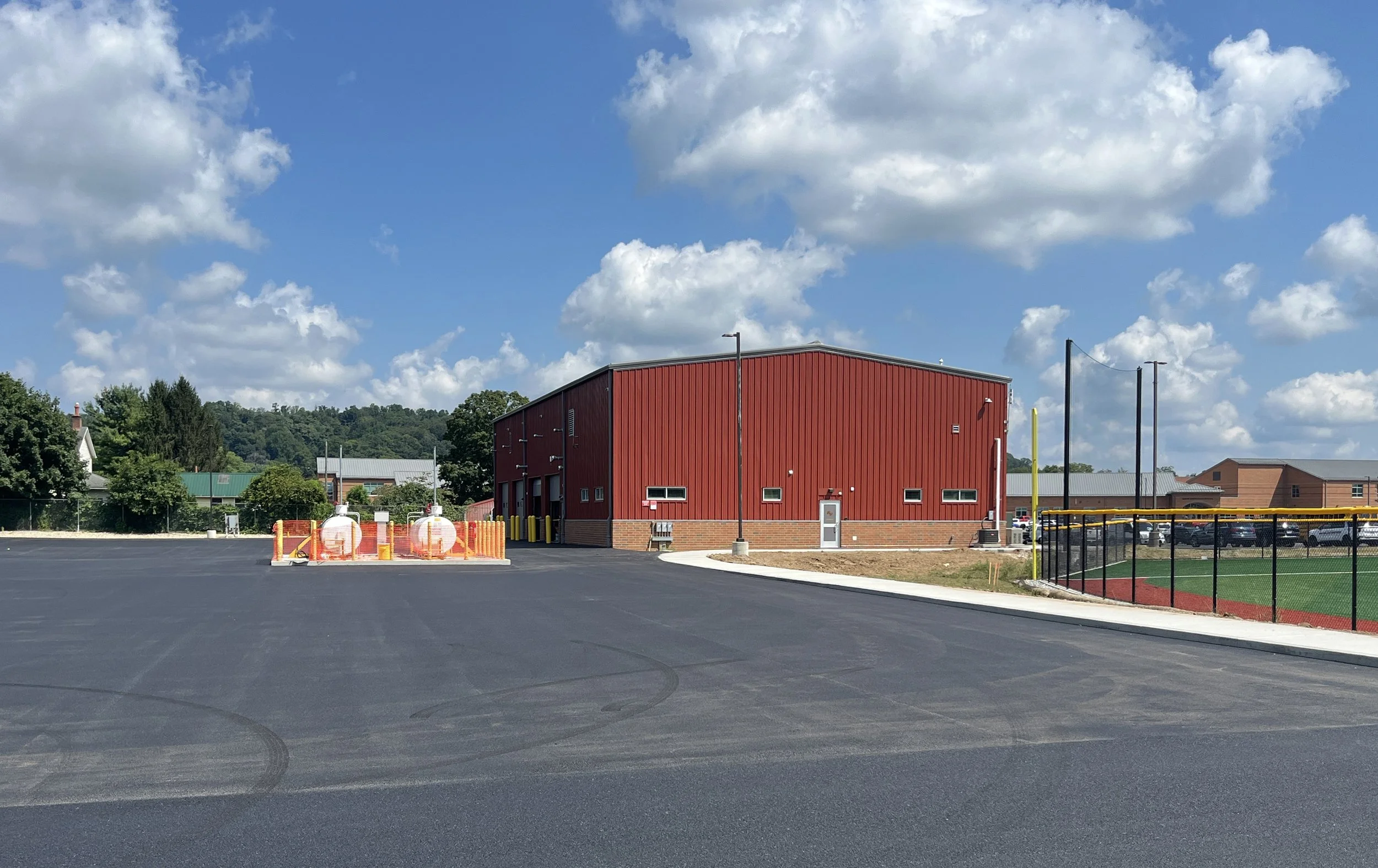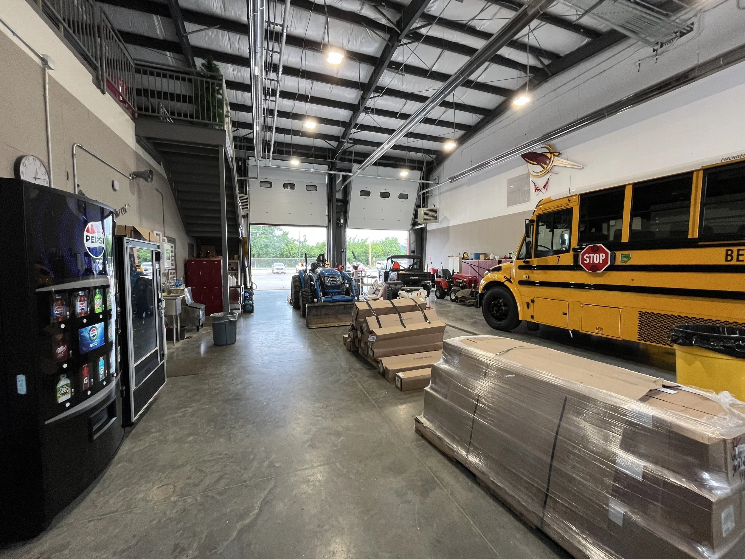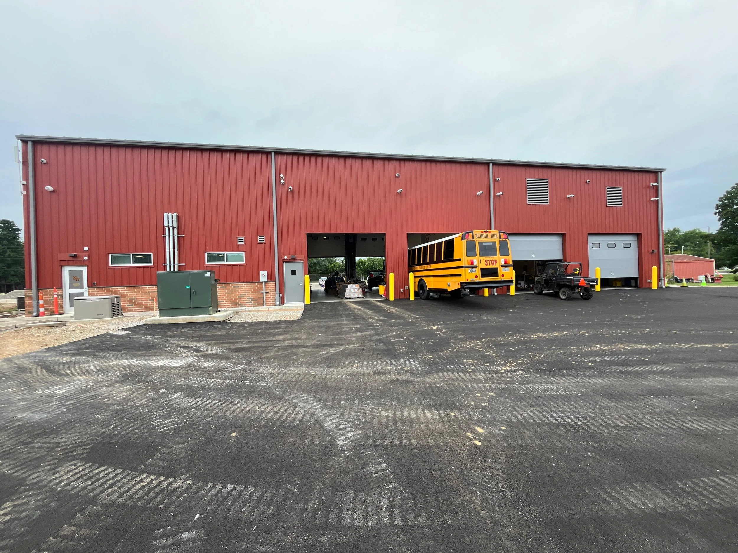 The building is a pre-engineered metal building, and the surrounding site is paved with heavy-duty asphalt to accommodate school bus traffic.